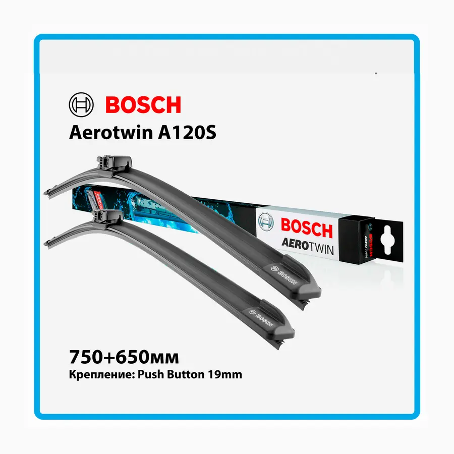 Новые стеклоочистители Bosch Aerotwin c плоским типом конструкции характеризуются, особенно при высоких скоростях, стабильностью и ветроустойчивостью. Удается в значительной степени избежать ненужных шумов и сохранить высокие качества очистки стекла при увеличении скорости.Крепление Push Button (кнопка) Особенности: для распашной системы с/о